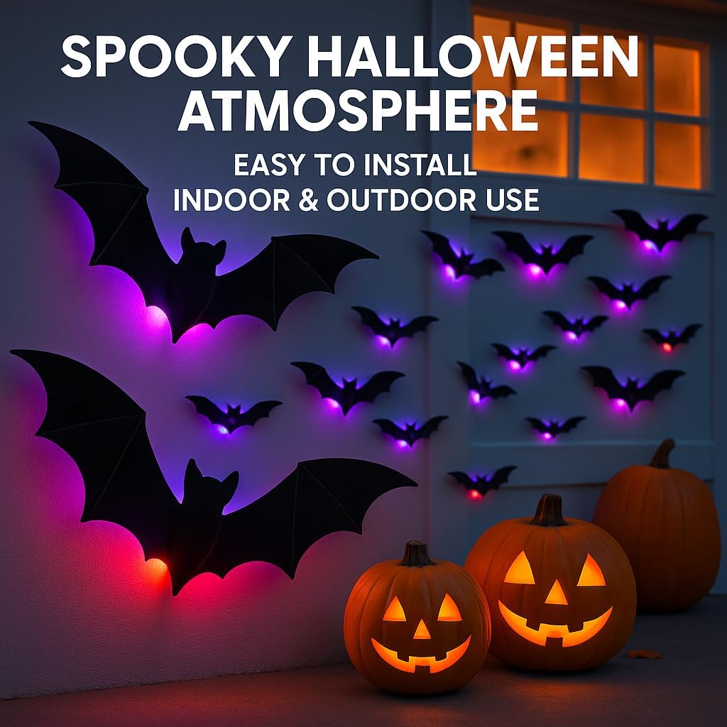 Hang iToolMax 3D Bat  / Spider / Ghost Halloween Wall Decors and watch your space glow with spooky LED lights. PVS Safety Material, 3 Light Colors (Blue, Red, Orange).