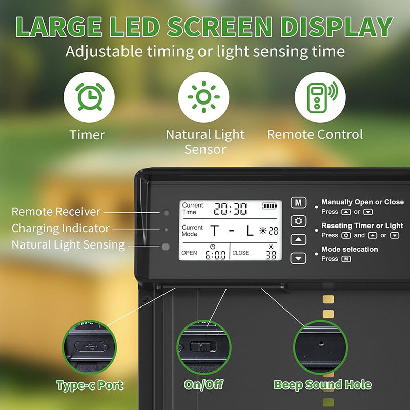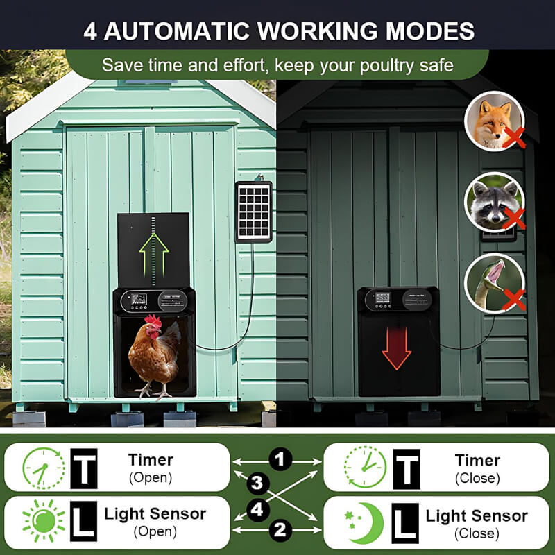 iToolmax Solar Automatic Chicken Coop Door opens and closes hands-free with solar power, timer, and remote, to make you easy, smart flock care chickens, ducks, rabbits and other small animals coop(less than 10 lb).